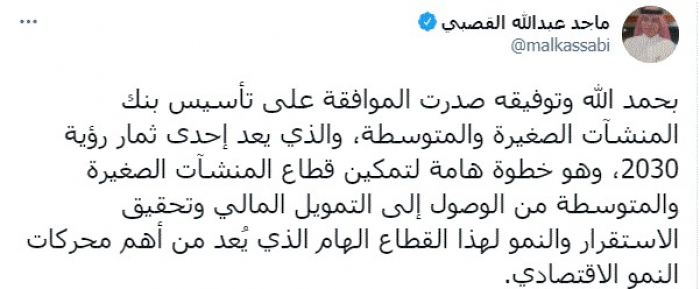 وقال في تغريدة عبر "تويتر" رصدها "المشهد العربي": " بحمد الله وتوفيقه صدرت الموافقة على تأسيس بنك المنشآت الصغيرة والمتوسطة، والذي يعد إحدى ثمار رؤية 2030، وهو خطوة هامة لتمكين قطاع المنشآت الصغيرة والمتوسطة من الوصول إلى التمويل المالي وتحقيق الاستقرار والنمو لهذا القطاع الهام الذي يُعد من أهم محركات النمو الاقتصادي".