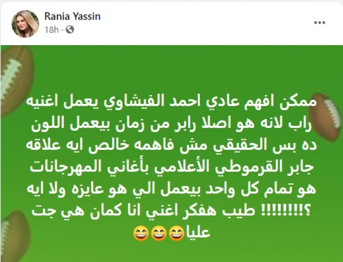 وكتبت "رانيا" عبر حسابها بموقع فيسبوك: "ممكن أفهم عادي أحمد الفيشاوي يعمل أغنيه راب لأنه هو أصلاً رابر من زمان بيعمل اللون ده بس الحقيقي مش فاهمة خالص".