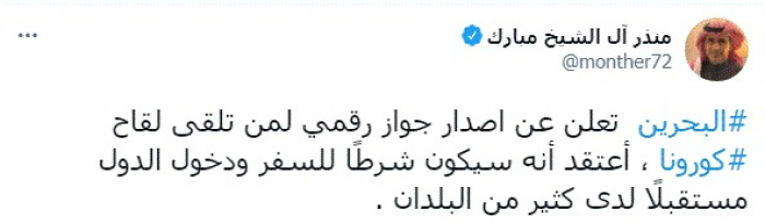وقال في تغريدة عبر "تويتر" رصدها "المشهد العربي": "البحرين تعلن عن إصدار جواز رقمي لمن تلقى لقاح كورونا، اعتقد أنه سيكون شرطًا للسفر ودخول الدول مستقبلًا لدى كثير من البلدان".