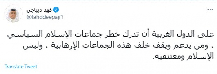 وقال في تغريدة عبر "تويتر" رصدها "المشهد العربي": "على الدول الغربية أن تدرك خطر جماعات الإسلام السياسي، ومن يدعم ويقف خلف هذه الجماعات الإرهابية، وليس الإسلام ومعتنقيه".