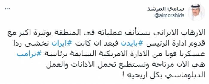 وأشار في تغريدة على حسابه بموقع التدوين المصغر تويتر، اليوم إلى أن: "الإرهاب الإيراني يستأنف عملياته في المنطقة بوتيرة أكبر مع قدوم إدارة الرئيس بايدن".