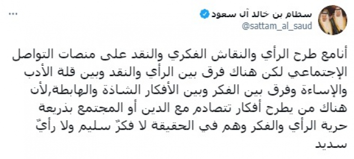 استهجن الأمير سطام بن خالد آل سعود، تذرع البعض بحرية الرأي لطرح آراء وأفكار شاذة وهابطة تتعارض مع الدين وأعراف المجتمع.
