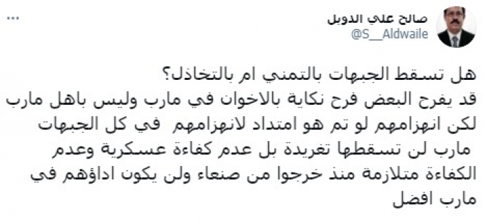 الدويل: سقوط مأرب مرتبط بتخاذل الشرعية وليس التغريدات