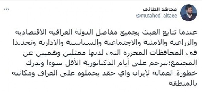 وأكد في تغريدة على حسابه بموقع التدوين المصغر تويتر، اليوم أنه: "عندما تتابع العبث بجميع مفاصل الدولة العراقية الاقتصادية والزراعية والأمنية والاجتماعية والسياسية والإدارية وتحديدا في المحافظات المحررة التي لديها ممثلين وهميين عن المجتمع؛ تترحم على أيام الدكتاتورية الأقل سوءا".