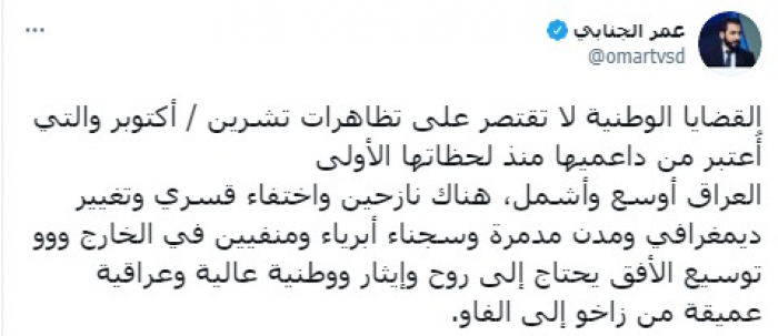 وشدد في تغريدة على حسابه بموقع التدوين المصغر تويتر، اليوم على أن: "القضايا الوطنية لا تقتصر على تظاهرات تشرين / أكتوبر، والتي أُعتبر من داعميها منذ لحظاتها الأولى".