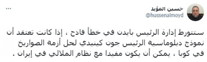 وقال في تغريدة على حسابه بموقع التدوين المصغر تويتر، اليوم إنه: "ستتورط إدارة الرئيس بايدن في خطأ فادح، إذا كانت تعتقد أن نموذج دبلوماسية الرئيس جون كينيدي لحل أزمة الصواريخ في كوبا، يمكن أن يكون مفيدا مع نظام الملالي في إيران".