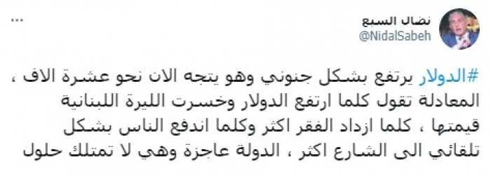 وأضاف أن: "المعادلة تقول كلما ارتفع الدولار وخسرت الليرة اللبنانية قيمتها، كلما ازداد الفقر أكثر وكلما اندفع الناس بشكل تلقائي إلى الشارع أكثر"، مؤكدا أن: "الدولة عاجزة وهي لا تمتلك حلول".