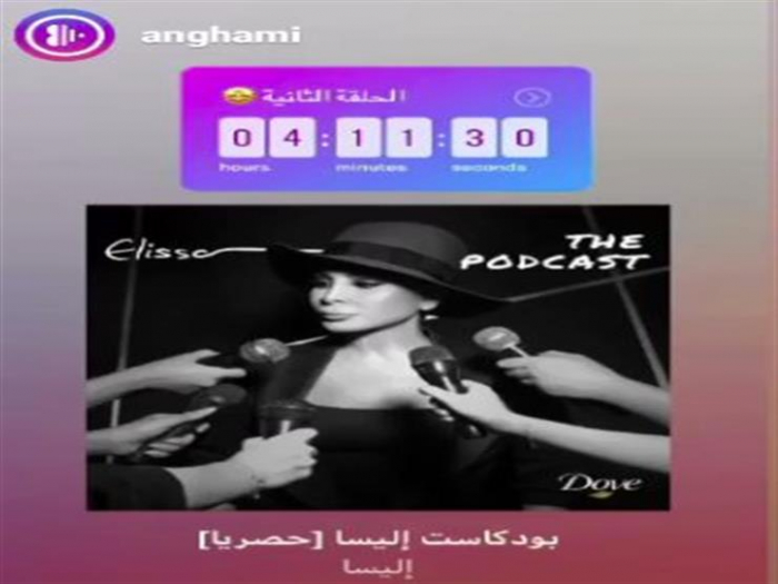 ظهرت النجمة اللبنانية إليسا، مساء الأربعاء، في ثاني حلقات "بودكاست إليسا" المذاع عبر تطبيق أنغامي للموسيقى، وهو التدوين الصوتي الذي قررت إليسا، العودة من خلاله لجمهورها بعد حذف شركة روتانا المحتوى الغنائي الخاص بها من عليه قبل ما يقرب من العامين.