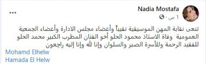 بينما كتبت الفنانة الكبيرة نادية مصطفى عضو نقابة المهن الموسيقية عبر صفحتها الرسمية بموقع فيسبوك: "تنعى نقابة المهن الموسيقية نقيبا وأعضاء مجلس الإدارة وأعضاء الجمعية العمومية، وفاة الأستاذ محمود الحلو أخو الفنان المطرب الكبير محمد الحلو، للفقيد الرحمة وللأسرة الصبر والسلوان وإنا لله وإنا إليه راجعون".