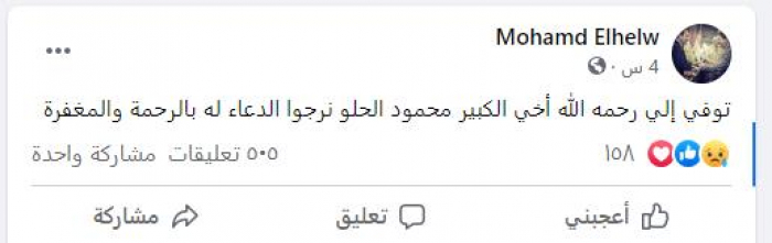 وكتب "الحلو" أمس عبر صفحته بموقع فيس بوك: "توفي إلى رحمة الله أخي الأكبر محمود الحلو، نرجو الدعاء له بالرحمة والمغفرة".