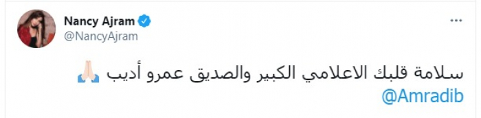 وكتبت نانسي تغريدة، عبر حسابها الرسمي بموقع"تويتر" :"سلامة قلبك الإعلامي الكبير والصديق عمرو أديب".
