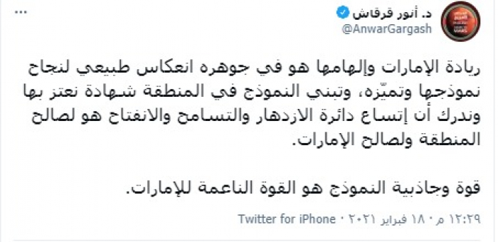 وكتب "قرقاش" تغريدة عبر حسابه بتويتر، رصدها " المشهد العربي ": "ريادة الإمارات وإلهامها هو في جوهره انعكاس طبيعي لنجاح نموذجها وتميّزه، وتبني النموذج في المنطقة شهادة نعتز بها وندرك أن إتساع دائرة الازدهار والتسامح والانفتاح هو لصالح المنطقة ولصالح الإمارات".
