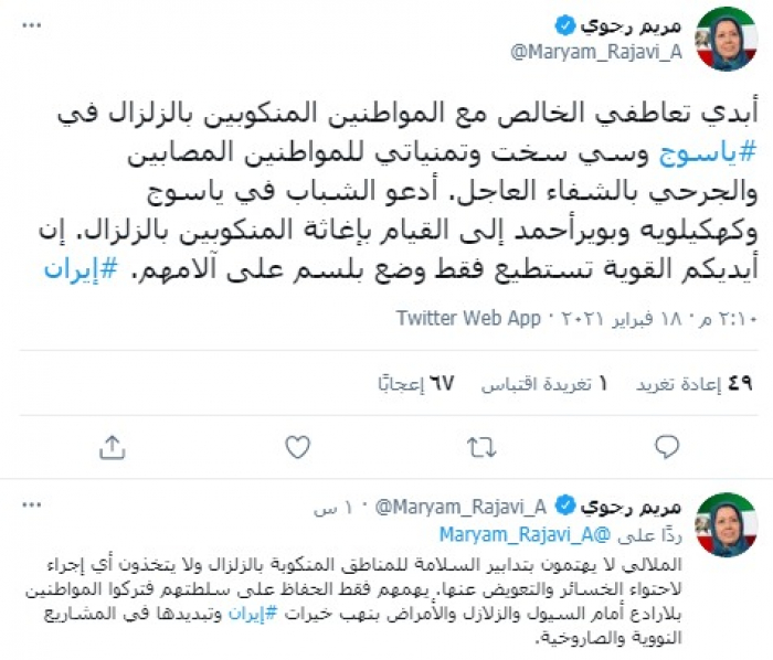 نددت زعيمة المعارضة الإيرانية مريم رجوي، بتجاهل نظام الملالي إغاثة المنكوبيين في زلزال ياسوج، مؤكدة أن النظام الإيراني مشغول بنهب خيرات البلاد.