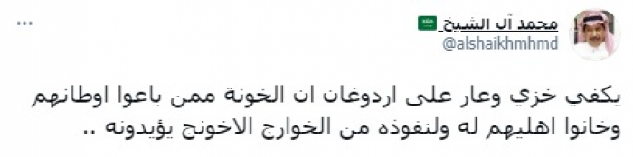 وقال في تغريدة على حسابه بموقع التدوين المصغر تويتر، اليوم إنه: "يكفي خزي وعار على أردوغان أن الخونة ممن باعوا أوطانهم وخانوا أهليهم له ولنفوذه من الخوارج الأخونج يؤيدونه".