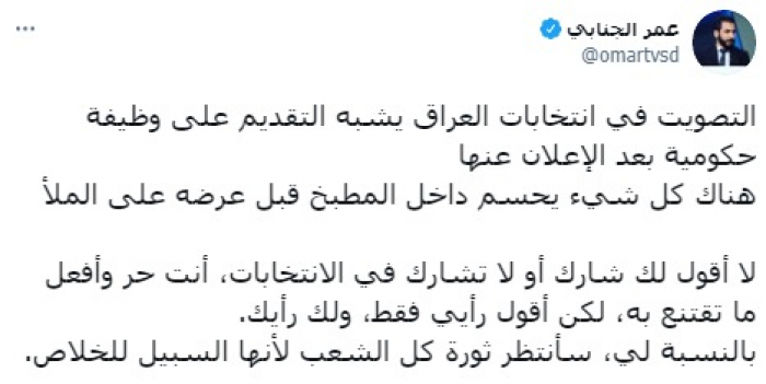 وأشار في تغريدة على حسابه بموقع التدوين المصغر تويتر، اليوم إلى أن: "التصويت في انتخابات العراق يشبه التقديم على وظيفة حكومية بعد الإعلان عنها".