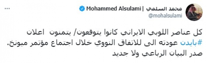 وأشار في تغريدة على حسابه بموقع التدوين المصغر تويتر، اليوم إلى أن: "كل عناصر اللوبي الإيراني كانوا يتوقعون/ يتمنون إعلان بايدن عودته إلى الاتفاق النووي خلال اجتماع مؤتمر ميونخ".