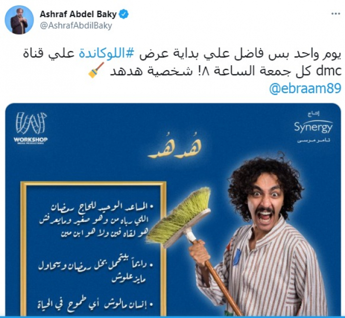 وغرد عبدالباقي عبر حسابه بموقع "تويتر"، ببوستر من المسرحية، وعلق: "يوم واحد بس فاضل على بداية عرض اللوكاندة على قناة dmc كل جمعة الساعة ٨!".