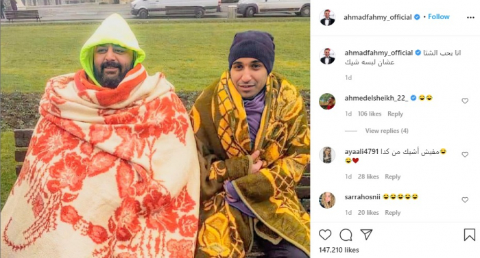 وظهر الثنائي في الصورة وهما يرتديان بطاطين وعلق "فهمي"، ساخرًا: "أنا بحب الشتا عشان لبسه شيك".