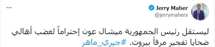 دعا الكاتب الصحفي اللبناني جيري ماهر، اليوم، رئيس الجمهورية اللبنانية ميشال عون للاستقالة احترامًا لغضب أهالي ضحايا تفجير مرفأ بيروت.