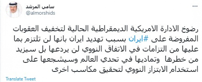 وكتب في تغريدة عبر "تويتر" رصدها "المشهد العربي": "رضوخ الإدارة الأمريكية الديمقراطية الحالية لتخفيف العقوبات المفروضة على إيران بسبب تهديد إيران بأنها لن تلتزم بما عليها من التزامات في الاتفاق النووي لن يردعها بل سيزيد من خطرها وتماديها في تحدي العالم وسيشجعها على استخدام الابتزاز النووي لتحقيق مكاسب أخرى".