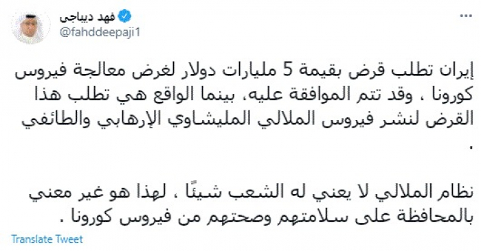 وقال في تغريدة عبر "تويتر" رصدها "المشهد العربي": "إيران تطلب قرض بقيمة 5 مليارات دولار لغرض معالجة فيروس كورونا، وقد تتم الموافقة عليه، بينما الواقع هي تطلب هذا القرض لنشر فيروس الملالي المليشياوي الإرهابي والطائفي".
