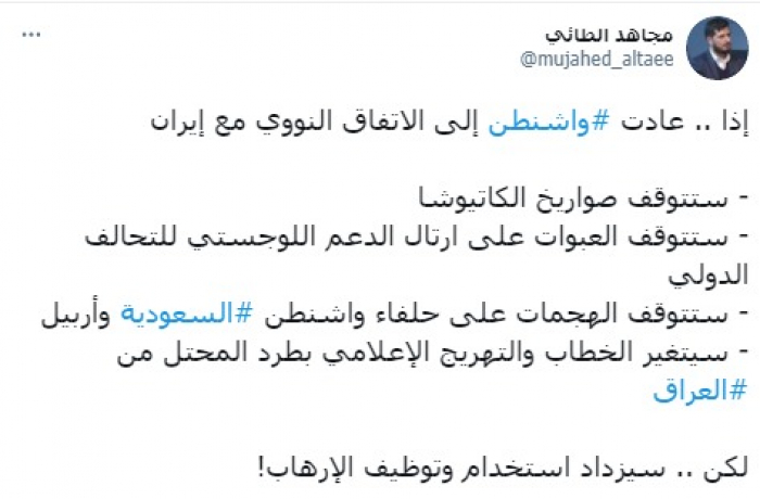 وشدد في تغريدة على حسابه بموقع التدوين المصغر تويتر، إنه: "إذا.. عادت واشنطن إلى الاتفاق النووي مع إيران، ستتوقف صواريخ الكاتيوشا، ستتوقف العبوات على أرتال الدعم اللوجستي للتحالف الدولي، ستتوقف الهجمات على حلفاء واشنطن السعودية وأربيل، سيتغير الخطاب والتهريج الإعلامي بطرد المحتل من العراق".