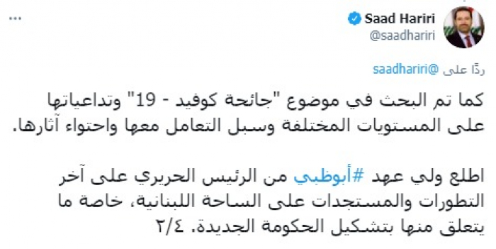 وأوضح: "اطلع ولي عهد أبوظبي من الرئيس الحريري على آخر التطورات والمستجدات على الساحة اللبنانية، خاصة ما يتعلق منها بتشكيل الحكومة الجديدة".
