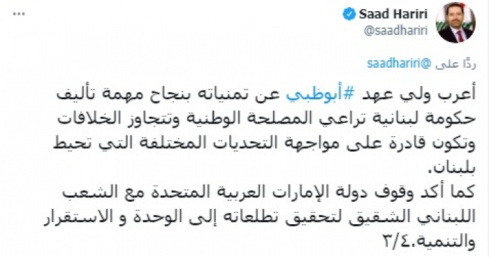 وأكد أنه: "أعرب ولي عهد أبوظبي عن تمنياته بنجاح مهمة تأليف حكومة لبنانية تراعي المصلحة الوطنية وتتجاوز الخلافات وتكون قادرة على مواجهة التحديات المختلفة التي تحيط بلبنان"، مضيفا: "كما أكد وقوف دولة الإمارات العربية المتحدة مع الشعب اللبناني الشقيق لتحقيق تطلعاته إلى الوحدة و الاستقرار والتنمية".