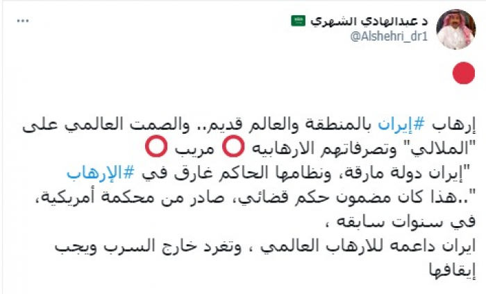 وأوضح في تغريدة على حسابه بموقع التدوين المصغر تويتر، اليوم أن: "إرهاب إيران بالمنطقة والعالم قديم، والصمت العالمي على (الملالي) وتصرفاتهم الإرهابية مريب".