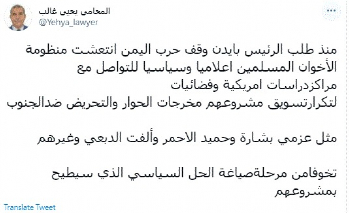وكتب في تغريدة عبر "تويتر" رصدها "المشهد العربي": "منذ طلب الرئيس بايدن وقف حرب اليمن انتعشت منظومة الإخوان المسلمين إعلاميًا وسياسيًا للتواصل مع مراكز دراسات أمريكية وفضائيات لتكرار تسويق مشروعهم مخرجات الحوار والتحريض ضد الجنوب".