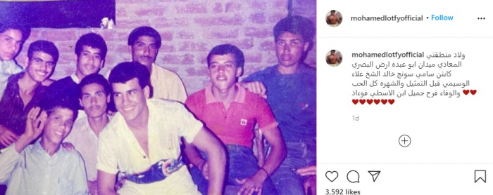 ونشر "لطفي" الصورة عبر حسابه على إنستجرام، وعلق: "ولاد منطقتي المعادي، ميدان أبو عبده - أرض البصري.. كابتن سامي سونج، خالد الشيخ، علاء الوسيمي.. قبل التمثيل والشهرة.. كل الحب والوفاء.. فرح جميل ابن الأسطى فؤاد".
