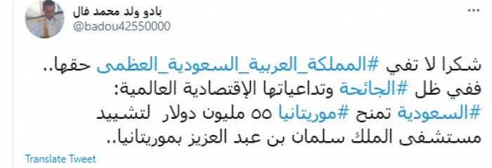 وقال في تغريدة عبر "تويتر" رصدها "المشهد العربي": "شكرا لا تفي المملكة العربية السعودية العظمى حقها.. ففي ظل الجائحة وتداعياتها الإقتصادية العالمية: السعودية تمنح موريتانيا ٥٥ مليون دولار لتشييد مستشفى الملك سلمان بن عبد العزيز بموريتانيا".