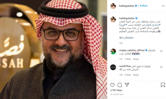 ونشر "غلوم" صورة لمشاري عبر حسابه على إنستجرام، وعلق: "يا رب سترك ولطفك يا رب في أخونا الفنان مشاري البلام في العناية بسبب كورونا اللعين.. نسأل القدير أن يأخذ بيده ويقويه ويقومه بالسلامة، يا رب العرش العظيم".