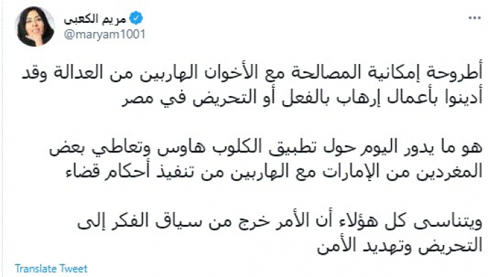 وقالت في تغريدة عبر "تويتر" رصدها "المشهد العربي": "أطروحة إمكانية المصالحة مع الأخوان الهاربين من العدالة وقد أدينوا بأعمال إرهاب بالفعل أو التحريض في مصر هو ما يدور اليوم حول تطبيق الكلوب هاوس وتعاطي بعض المغردين من الإمارات مع الهاربين من تنفيذ أحكام قضاء ويتناسى كل هؤلاء أن الأمر خرج من سياق الفكر إلى التحريض وتهديد الأمن".