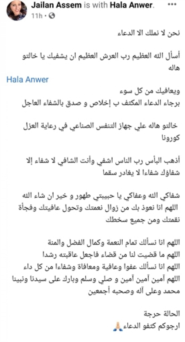 وكتبت "جيلان" عبر حسابها على فيسبوك: "نحن لا نملك إلا الدعاء أسأل الله العظيم رب العرش العظيم أن يشفيك يا خالتو هالة ويعافيك من كل سوء، برجاء الدعاء المكثف بإخلاص وصدق بالشفاء العاجل، خالتو هالة على جهاز التنفس الصناعي في رعاية العزل.. كورونا.. الحالة حرجة.. أرجوكم الدعاء".