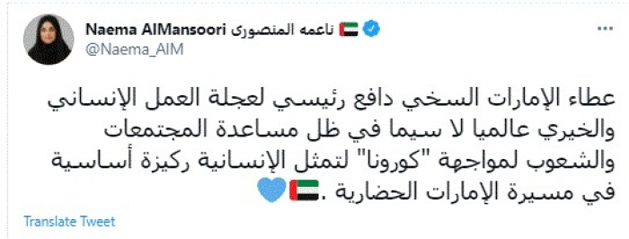 وكتبت في تغريدة عبر "تويتر" رصدها "المشهد العربي": "عطاء الإمارات السخي دافع رئيسي لعجلة العمل الإنساني والخيري عالميا لا سيما في ظل مساعدة المجتمعات والشعوب لمواجهة كورونا لتمثل الإنسانية ركيزة أساسية في مسيرة الإمارات الحضارية".