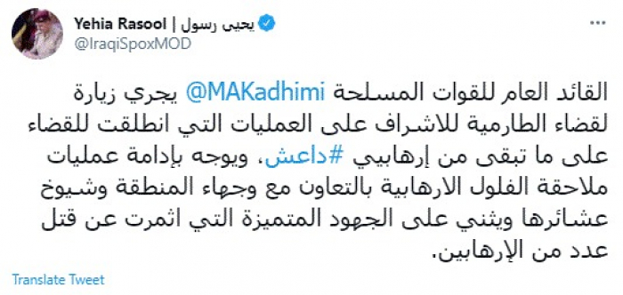 وكتب في تغريدة عبر "تويتر" رصدها "المشهد العربي": "القائد العام للقوات المسلحة يجري زيارة لقضاء الطارمية للاشراف على العمليات التي انطلقت للقضاء على ما تبقى من إرهابيي داعش، ويوجه بإدامة عمليات ملاحقة الفلول الإرهابية بالتعاون مع وجهاء المنطقة وشيوخ عشائرها ويثني على الجهود المتميزة التي اثمرت عن قتل عدد من الإرهابين".