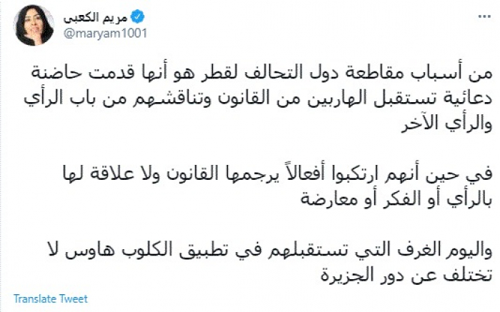 وقالت في تغريدة عبر "تويتر" رصدها "المشهد العربي": "من أسباب مقاطعة دول التحالف لقطر هو أنها قدمت حاضنة دعائية تستقبل الهاربين من القانون وتناقشهم من باب الرأي والرأي الآخر في حين أنهم ارتكبوا أفعالاً يرجمها القانون ولا علاقة لها بالرأي أو الفكر أو معارضة واليوم الغرف التي تستقبلهم في تطبيق الكلوب هاوس لا تختلف عن دور الجزيرة".