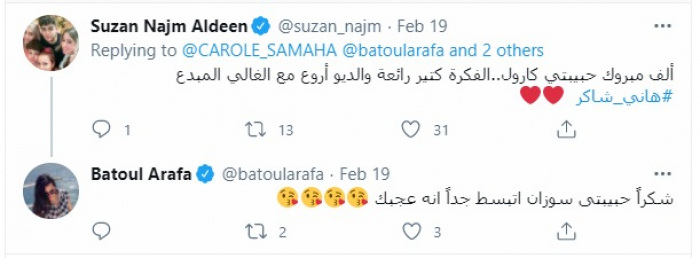 وكتبت "سوزان" عبر حسابها على تويتر: "ألف مبروك حبيبتي (كارول).. الفكرة كتير رائعة والديو أروع مع الغالي المبدع هاني شاكر".