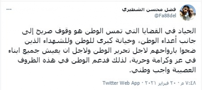 وكتب "الشطيري" تغريدة عبر حسابه بتويتر، رصدها "المشهد العربي": "الحياد في القضايا التي تمس الوطن هو وقوف صريح إلى جانب أعداء الوطن، وخيانة كبرى للوطن وللشهداء الذين ضحوا بأرواحهم لأجل تحرير الوطن، ولأجل أن يعيش جميع أبنائه في عز وكرامة وحرية، لذلك فدعم الوطن في هذه الظروف العصيبة واجب وطني".