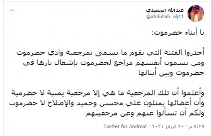 وكتب "الجعيدي" تغريدة عبر حسابه بتويتر، رصدها "المشهد العربي": "يا أبناء حضرموت: احذروا الفتنة التي تقوم ما تسمى بمرجعية وادي حضرموت ومن يسمون أنفسهم مراجع لحضرموت بإشعال نارها في حضرموت وبين أبنائها".