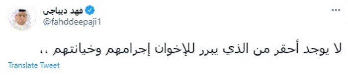 وقال في تغريدة عبر "تويتر" رصدها "المشهد العربي": "لا يوجد أحقر من الذي يبرر للإخوان إجرامهم وخيانتهم".