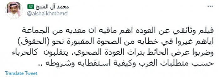 وقال في تغريدة عبر "تويتر" رصدها "المشهد العربي": "فيلم وثائقي عن العوده أهم ما فيه أن معديه من الجماعة إياهم غيروا في خطابه من الصحوة المقبورة نحو (الحقوق) وضربوا عرض الحائط بتراث العودة الصحوي، يتقلبون كالحرباء حسب متطلبات الغرب وكيفية استقطابه وشروطه".