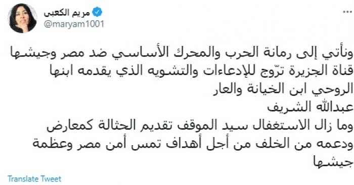 وكتبت في تغريدة عبر "تويتر" رصدها "المشهد العربي": "ونأتي إلى رمانة الحرب والمحرك الأساسي ضد مصر وجيشها قناة الجزيرة ترّوج للإدعاءات والتشويه الذي يقدمه ابنها الروحي ابن الخيانة والعار عبدالله الشريف".