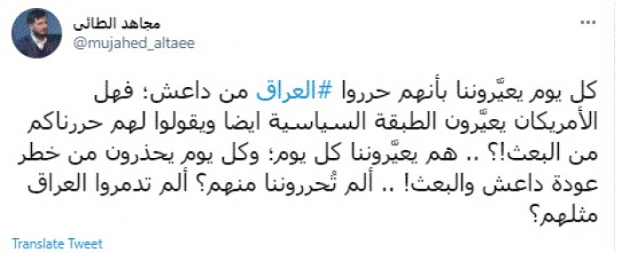 وقال في تغريدة عبر "تويتر" رصدها "المشهد العربي": "كل يوم يعيَّروننا بأنهم حرروا العراق من داعش؛ فهل الأمريكان يعيَّرون الطبقة السياسية ايضا ويقولوا لهم حررناكم من البعث!؟ .. هم يعيَّروننا كل يوم؛ وكل يوم يحذرون من خطر عودة داعش والبعث! .. ألم تُحرروننا منهم؟ ألم تدمروا العراق مثلهم؟".