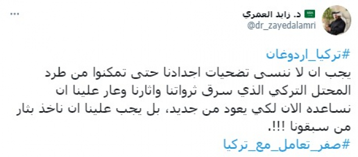وتابع: " وعار علينا أن نساعده الآن لكي يعود من جديد، بل يجب علينا ان ناخذ بثار من سبقونا!!!، مختتما بهاشتاج: "صفر تعامل مع تركيا".