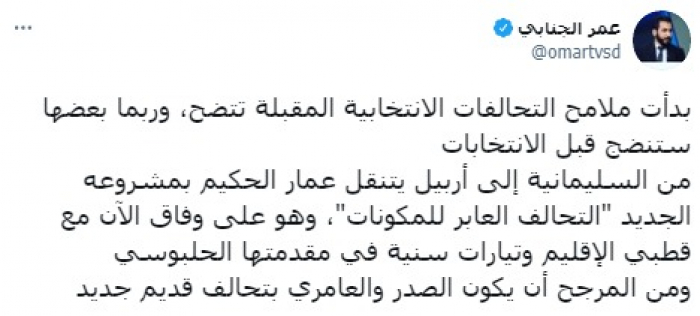 وتابع: "يتنقل عمار الحكيم بمشروعه الجديد (التحالف العابر للمكونات)، وهو على وفاق الآن مع قطبي الإقليم وتيارات سنية في مقدمتها الحلبوسي".