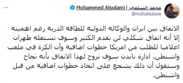 وشدد في تغريدة على حسابه بموقع التدوين المصغر تويتر، اليوم على أن: "الاتفاق بين إيران والوكالة الدولية للطاقة الذرية رغم أهميته إلا أنه اتفاق شكلي لن يقدم الكثير وسوف تستغله طهران إعلاميا للطلب من أمريكا خطوات أضافية وأن الكرة في ملعب واشنطن.