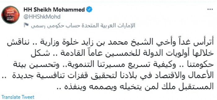 وكتب في تغريدة عبر "تويتر" رصدها "المشهد العربي": "أترأس غداً وأخي الشيخ محمد بن زايد خلوة وزارية .. نناقش خلالها أولويات الدولة للخمسين عاماً القادمة .. شكل حكومتنا .. وكيفية تسريع مسيرتنا التنموية.. وتحسين بيئة الأعمال والاقتصاد في بلادنا لتحقيق قفزات تنافسية جديدة .. المستقبل ملك لمن يتخيله ويصممه وينفذه".