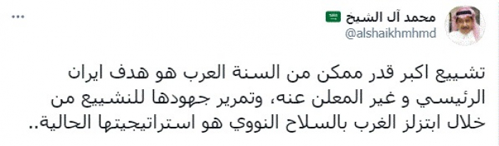 وقال في تغريدة عبر "تويتر" رصدها "المشهد العربي": "تشييع أكبر قدر ممكن من السنة العرب هو هدف إيران الرئيسي وغير المعلن عنه، وتمرير جهودها للنشييع من خلال ابتزلز الغرب بالسلاح النووي هو استراتيجيتها الحالية".